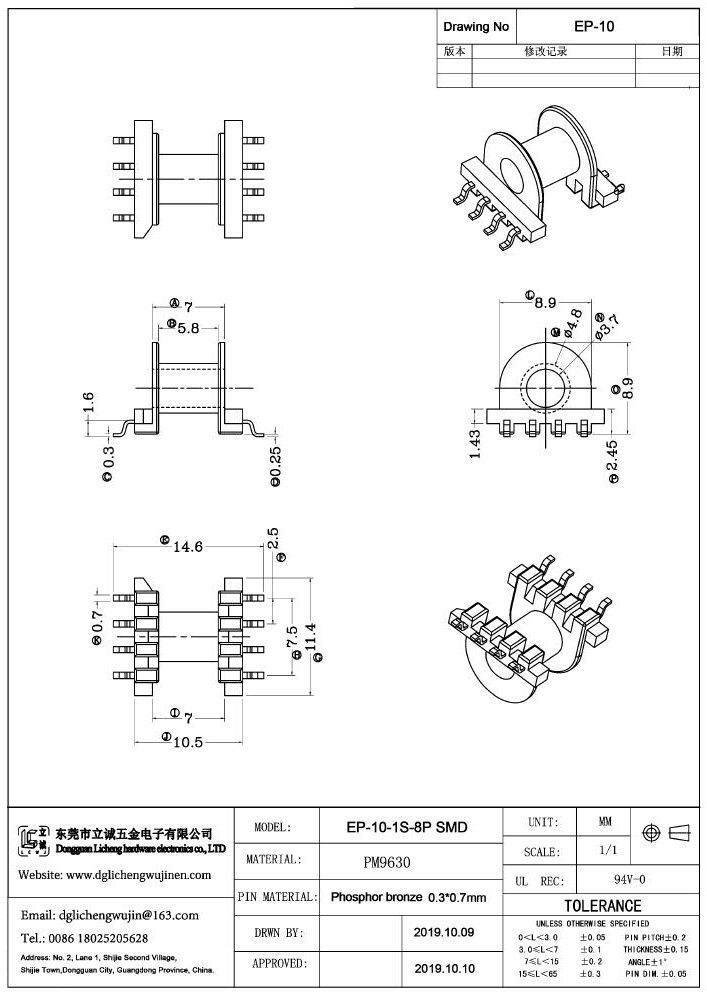 EP10 SMT Transformer Bobbins (4+4P),EP10 Transformer Accessories Bobbins,PM9630 Material, With Good High Temperature Resistance.