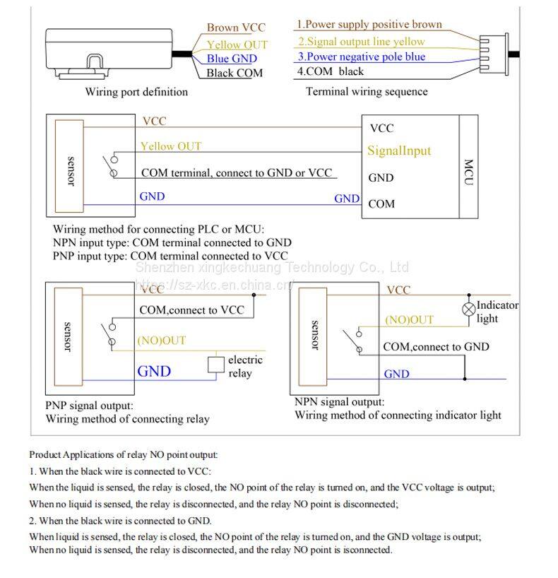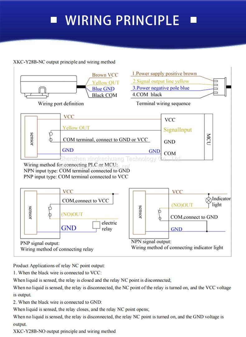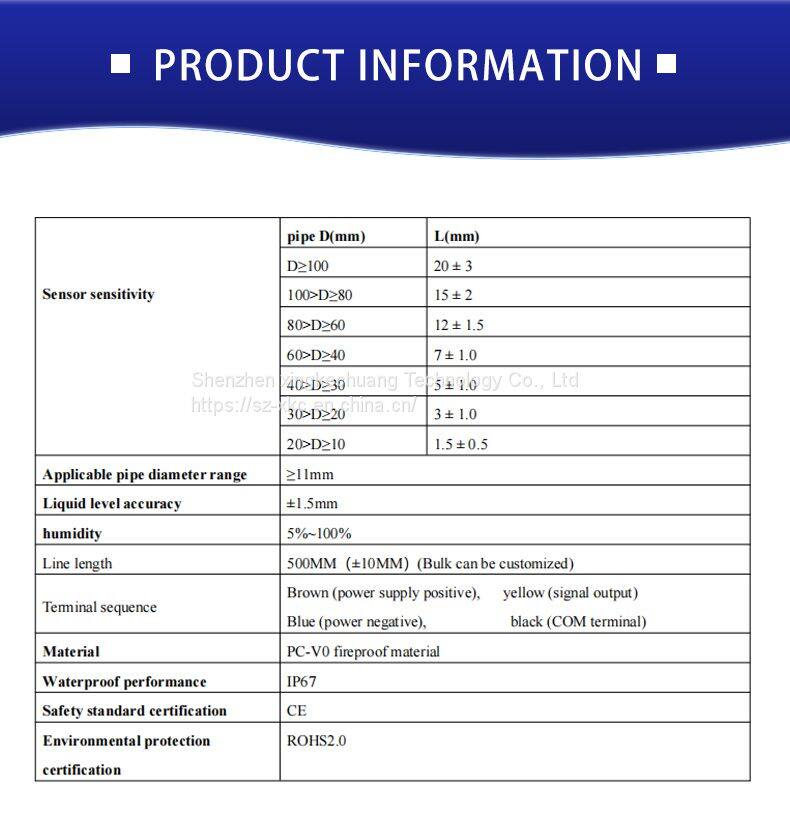 3rd. working principle The intelligent non-contact liquid level sensor uses the inductive capacitance of water to detect whether there is liquid. When there is no liquid close to the sensor, the sensor has a certain static capacitance to the ground due to the distributed capacitance on the sensor. When the liquid level slowly rises and approaches the sensor, the parasitic capacitance of the liquid will be coupled to this static capacitance, making the capacitance value of the sensor larger, and the changed capacitance signal is then input to the control IC for signal conversion. The capacitance is converted into a change of a certain electrical signal, and then a certain algorithm is used to detect and judge the degree of this change. When the change exceeds a certain threshold, it is considered that the liquid level has reached the sensing point.