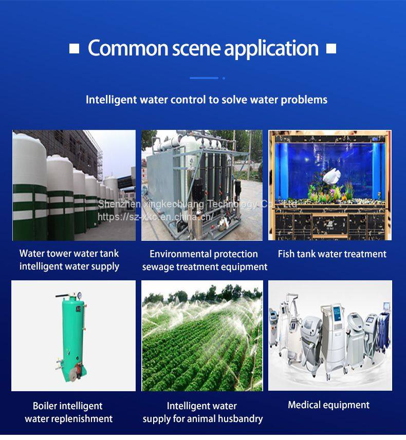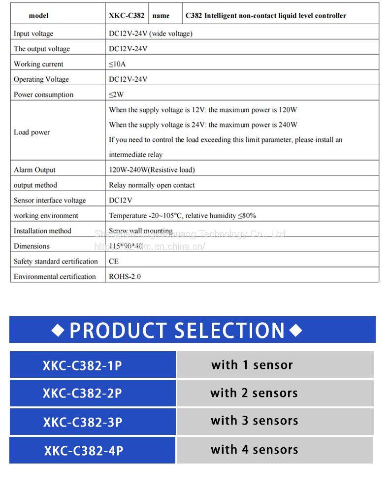 XKC-C382 Intelligent non-contact liquid level controller and two non-contact liquid level detection heads realize the function of liquid level high and low control: when the container liquid level is too low, the low liquid level alarm signal sent by the low liquid level sensor is triggered to trigger C382 The controller closes the relay and starts the water pump to add the liquid level. When the liquid level reaches a certain height, the high liquid level sensor sends out a signal to trigger the C382 controller to open the relay and automatically stop the water pump to work in this way. Thereby, the function of automatic control of the container liquid level is realized, and the container liquid level is kept stable.