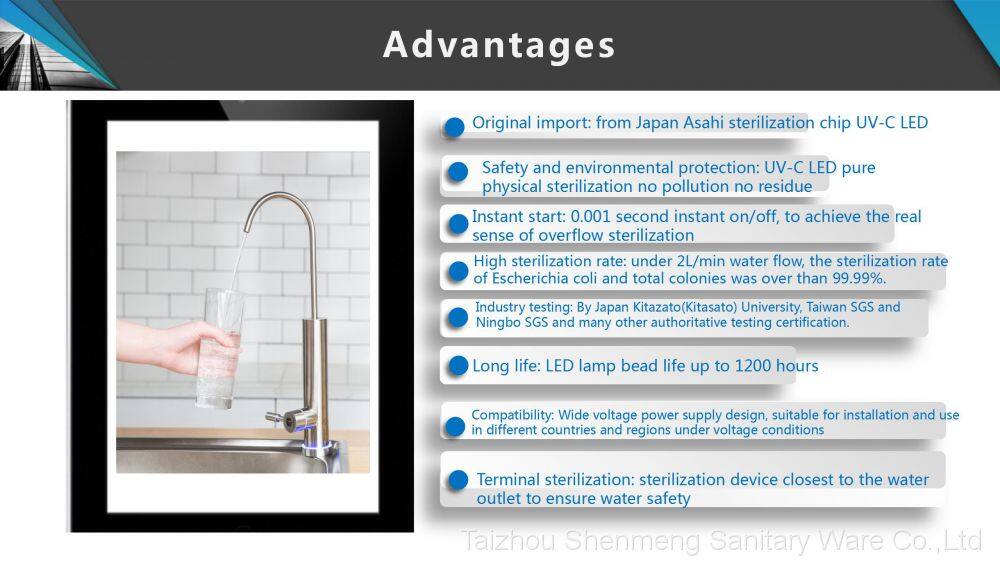 The sterilization faucets are based on the latest UVC LED technology to provide safe and reliable drinking water for home and business consumers. This series of products provides mercury-free, environmentally friendly sterilization treatment, won’t change the composition of the water, or residual harmful substances, to provide customers with a safe and secure direct drinking water source.The more safer and healthier drinking water except eliminating chlorine ,odor, heavy metal,reducing particulate,But also bacteria.