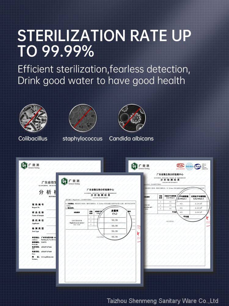 ① This faucet has been tested and proven by Japan’s Kitazato University, Taiwan SGS and Ningbo SGS,which can completely kill harmful bacteria in the water,including viruses.At 2L/Min water flow,the disinfection performance greater than 99.99% against Escherichia coli and the number of colonies is 4CFU/ML.