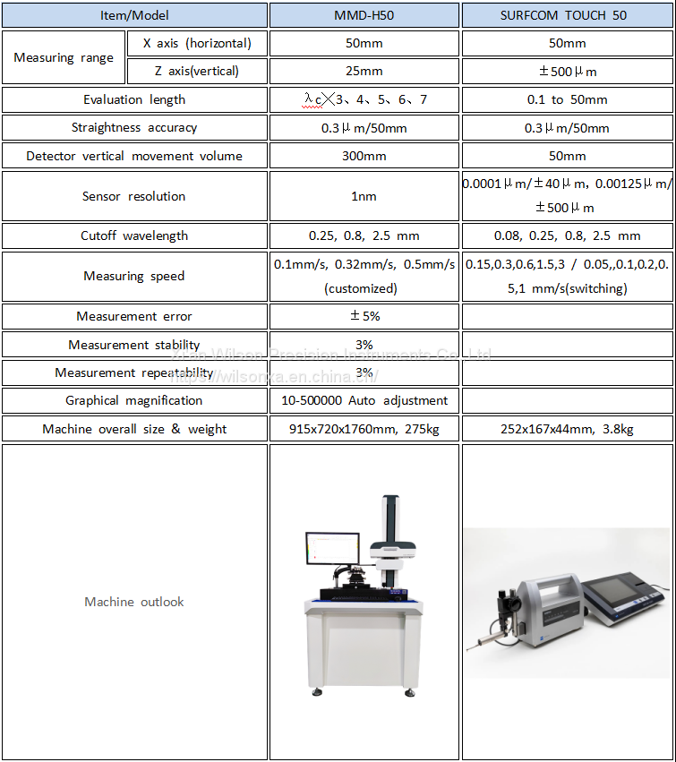 Comparison Table between MMD-H50 and Surfcom Touch 50