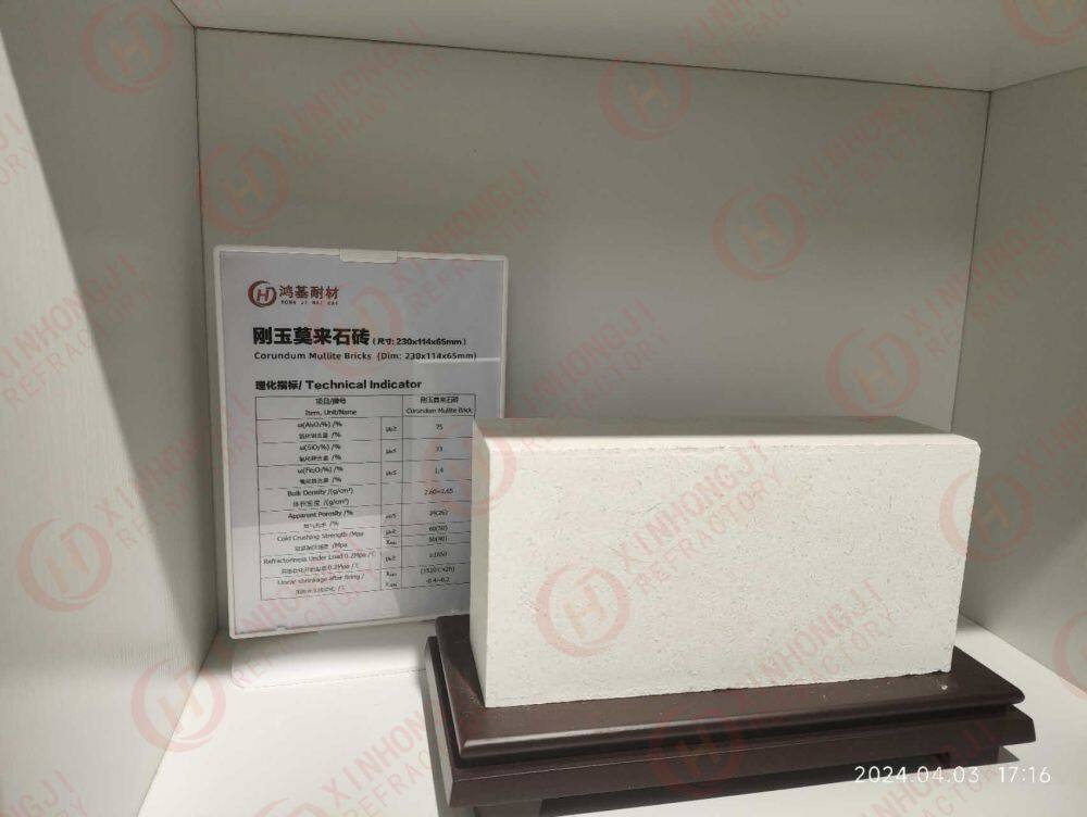 Corundum Mullite bricks are produced by sintering of high purity fused corundum, synthetic mullite and chromium oxide, i.e. pure alumina and mullite materials are the main raw materials, then adding proper metal fines, processed by moulding under high pressure and sintering under high temperature (1650℃~1750℃). Corundum-Mullite Brick is a high quality furnace refractory brick, Xinhongji Refractory can provide you corundum mullite brick with customized sizes.