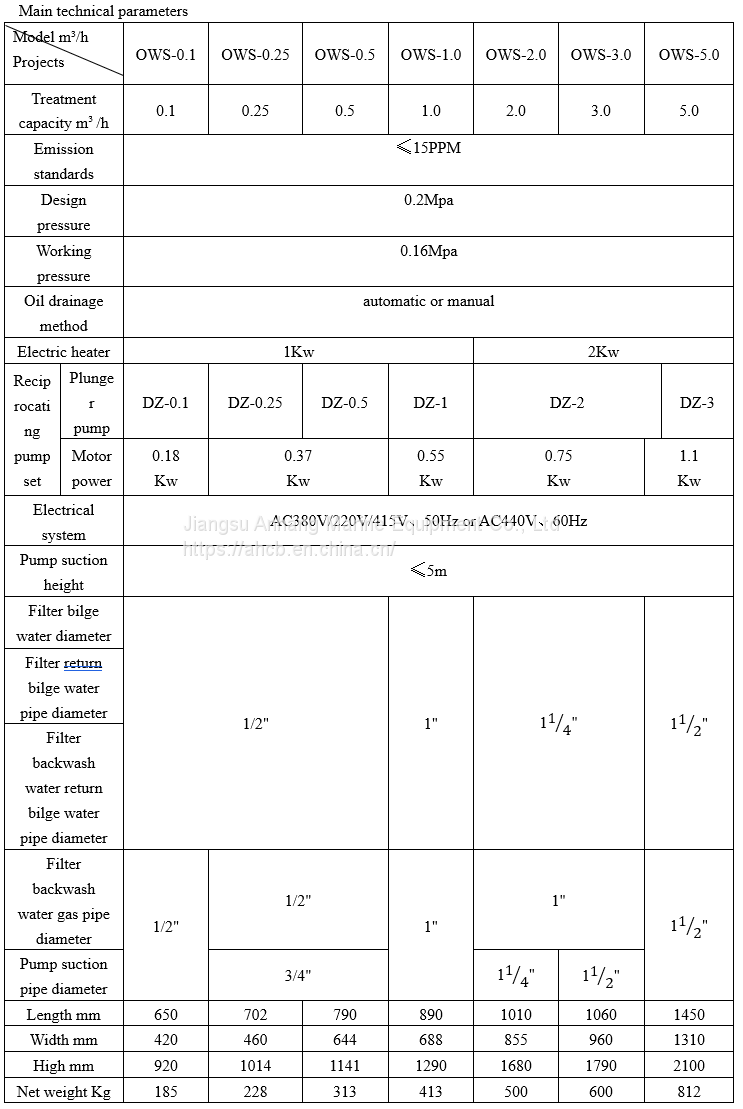 The series devices are: OWS-0.1m3/h, OWS-0.25m3/h, OWS-0.5m3/h, OWS-1.0m3/h, OWS-2.0m3/h, OWS-3.0m3/h, OWS-3.0m3/h and OWS-5.0m3/h. There are 7 kinds of specifications.