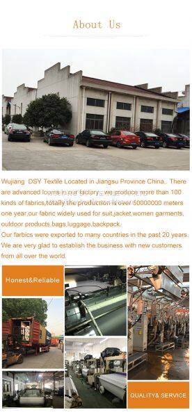 Wujiang DSY Textile Located in Jiangsu Province China,. There are advanced looms in our factory , we produce more than 100 kinds of fabrics,totally the production is over 50000000 meters one year,our fabric widely used for suit jacket, women garments,outdoor products,bags,luggage,backpack.Our farbics were exported to many countries in the past 20 years.