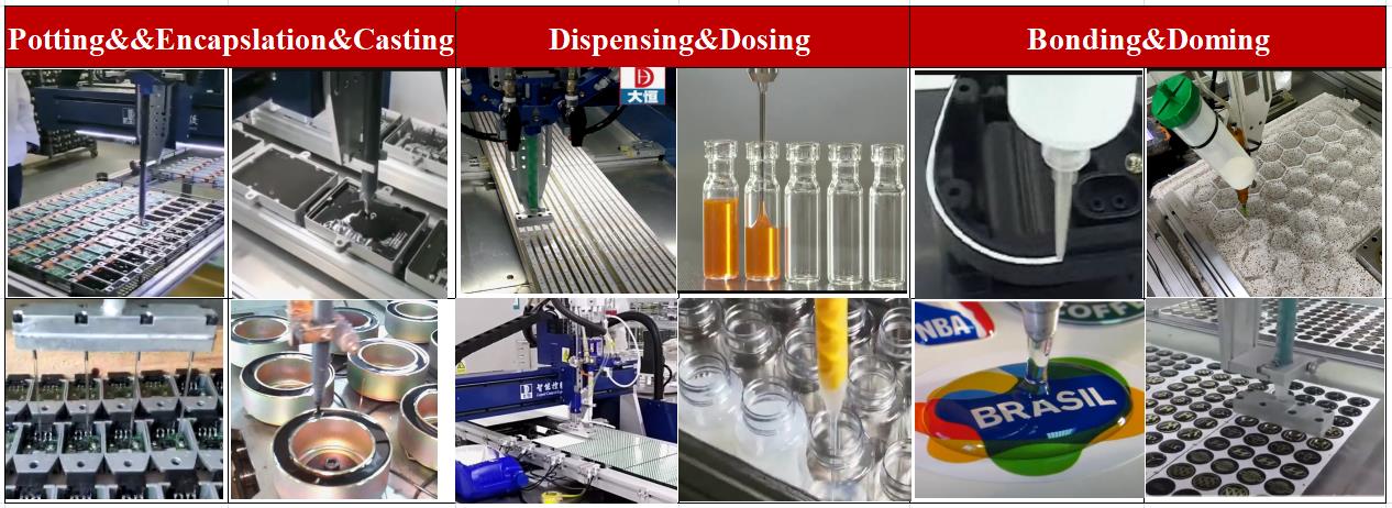 We offer automatic ,se-mi automatic fluid dispensing potting machine and the related production line and vacuuming systems .AB glue dispensing machine Epoxy dispensing machine Two-component dispensing machine Dual-component dispensing machine Meter-mix dispensing machine Resin dispensing machine Adhesive dispensing system Dispensing robot Dispensing valve Liquid dispenser Automated dispensing equipment