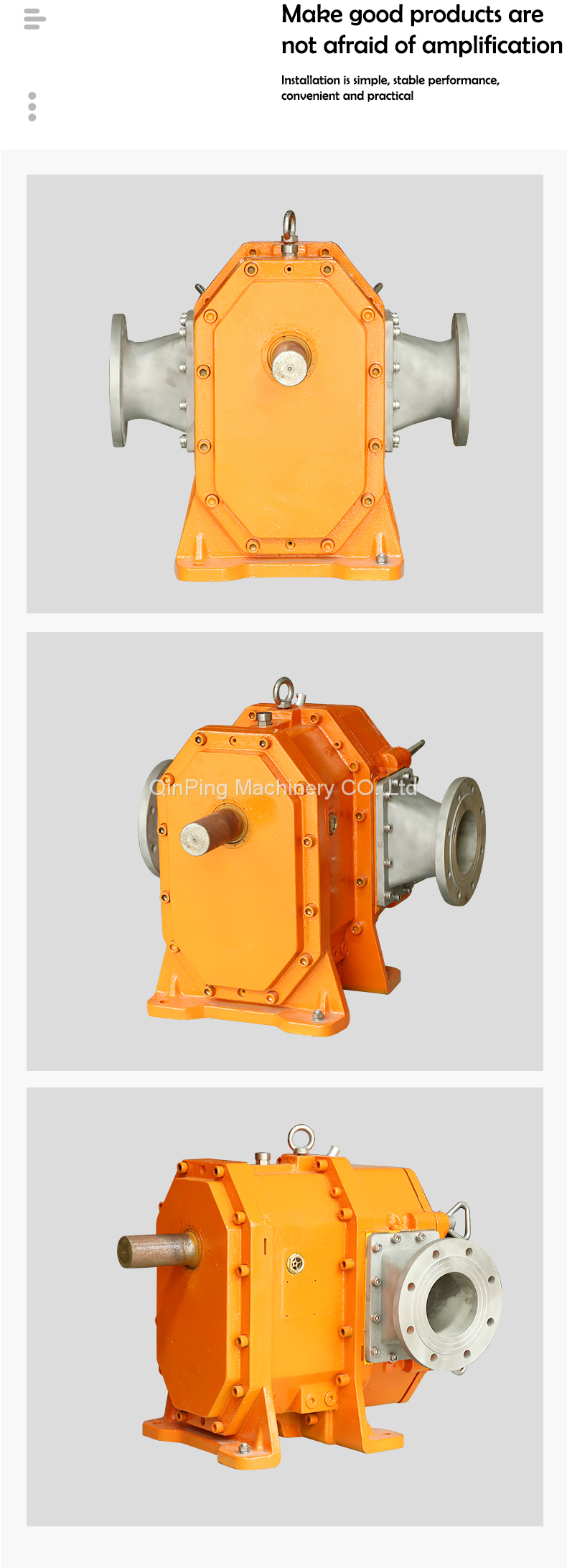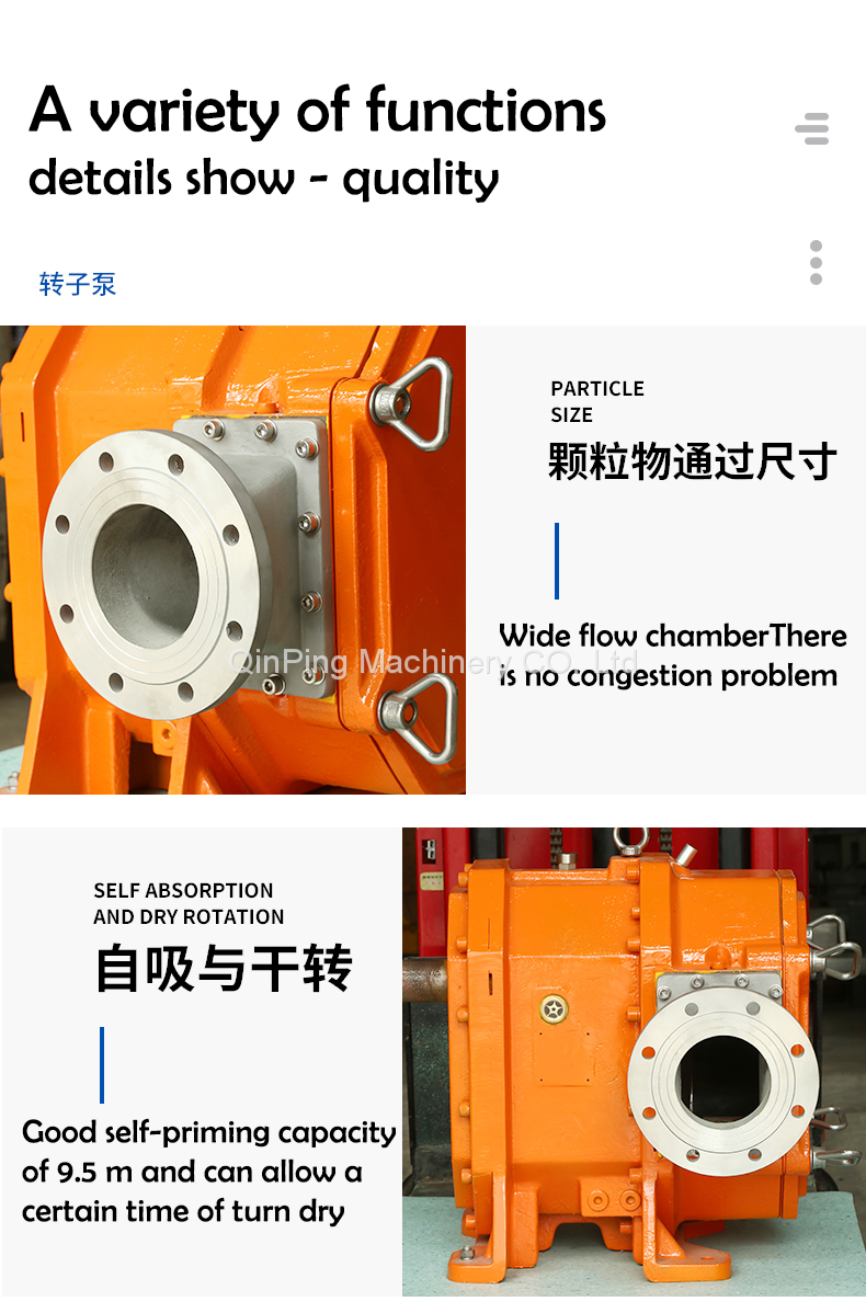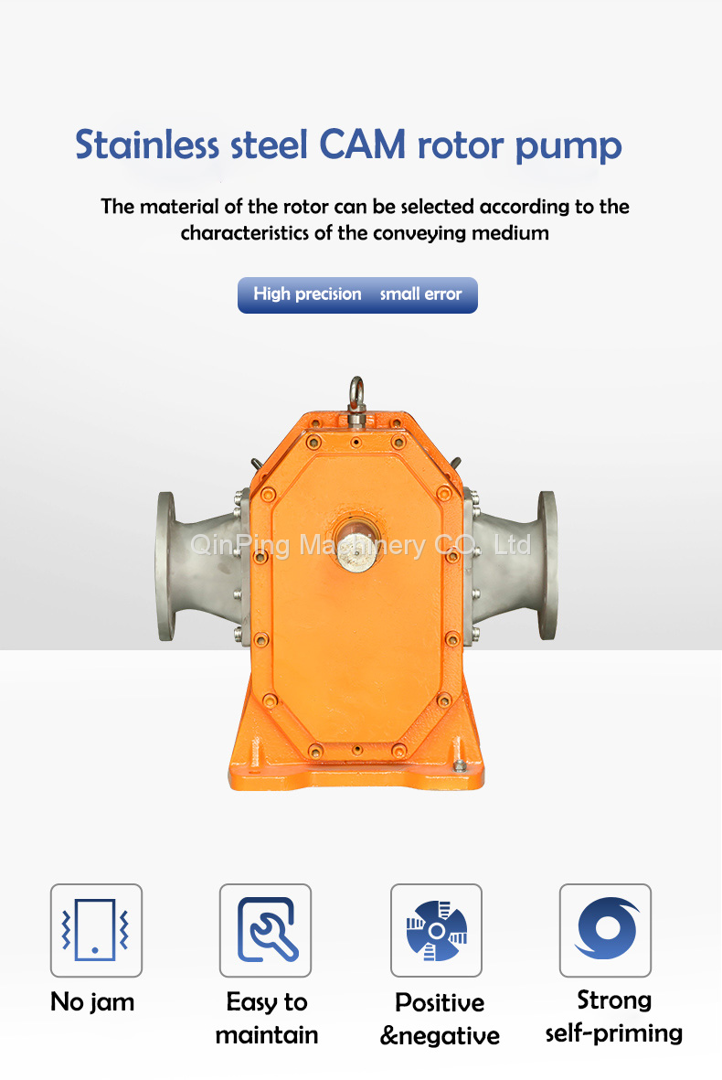 Wear-resistant, leak-free, sanitary, corrosion-resistant, positive and negative rotor CAM pumps have opened up their own market competitiveness in various industries. Qinping rotor pump includes a series of 7 models, flow range in 0.2- 1000m³/h, Qinping machinery rotor pump has a variety of materials to choose, so as to ensure that every user to provide an ideal rotor pump. For rotor, shaft seal, flange, O-ring, pump shell and protective lining plate and other parts, Qinping machinery can be selected according to the actual situation. At the same time, we can provide a complete set of units, including CAM pump, base, motor reducer, flange.