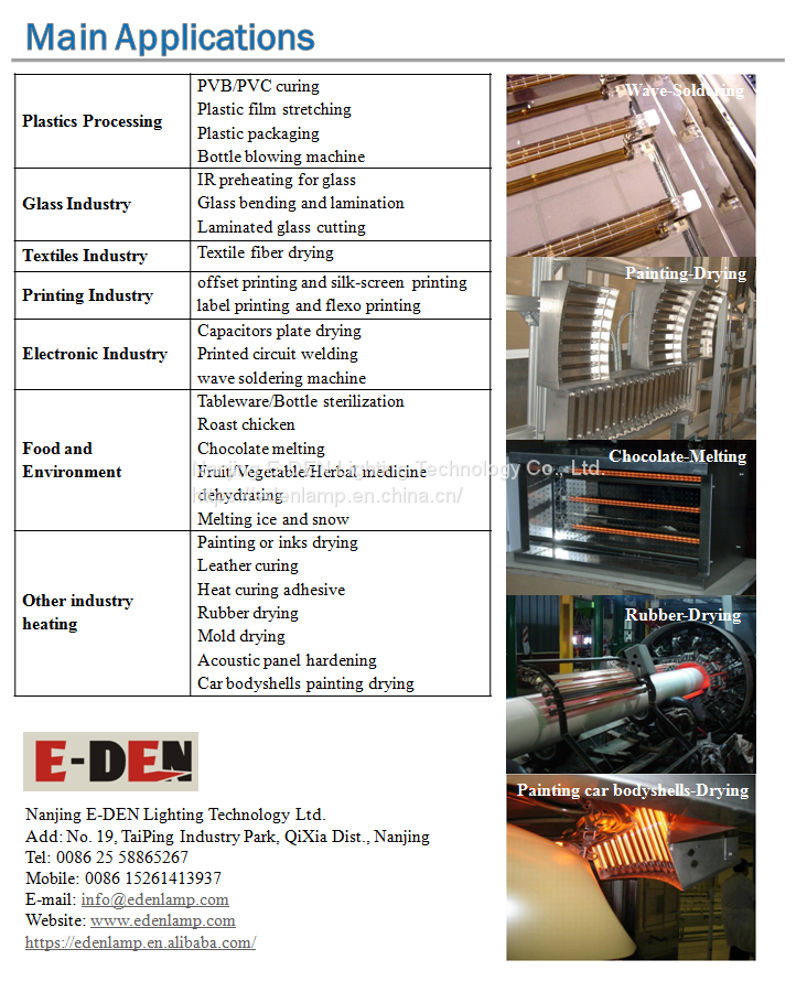 - Main products: quartz infrared lamp, quartz heating lamp, quartz infrared emitter, IR quartz lamp, IR heat lamp, medium wave infrared emitter, short wave infrared heat lamp, fast medium wave quartz infrared heater, carbon infrared heat lamp, single tube infrared lamp, twin tube quartz infrared emitter, quartz plate