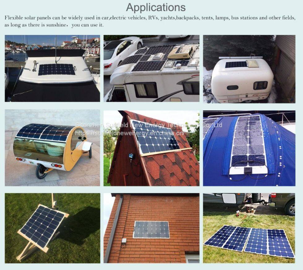 11) Widely used: golf cars, yachts, boats, caravans, electric cars, travel tourism cars, patrol cars, roofs, camping, roof power generations, tents, portable bags, backpacks, portable generator kits etc..