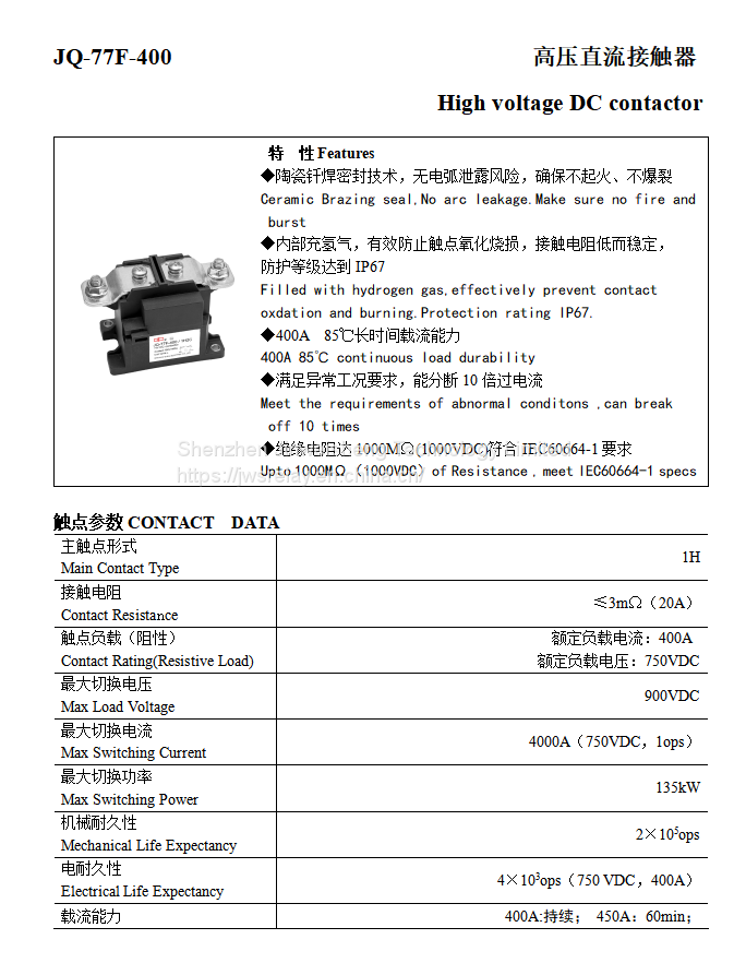 JQ-77F-400 Square Ceramic Brazing Sealed High Voltage DC Contactor Load Current 400A
