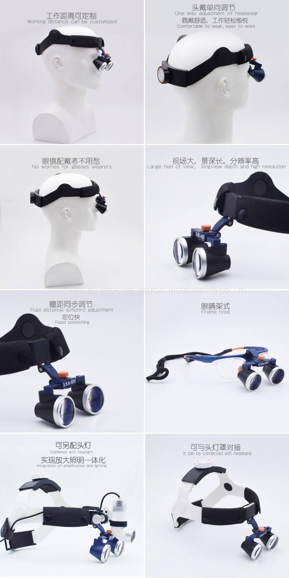 The product is a Galileo frame-type loupe with low magnification, the pupil distance is synchronously adjusted,the joint can be adjusted up and down to get accurate observation position quickly.