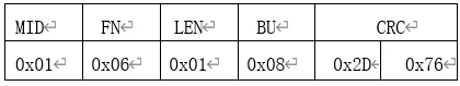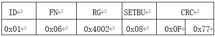 01 06 40 02 08 0F 77ID: 0x01~0xFEFN: 0x06RG: 0x4002 Baud rate register address 2 bytesSETBU:(0x01~0x08)set the baud rate of XZ-MUS-LTH from 1200bps to 115200bps01:1200bps 02:2400bps 03:4800bps 04:9600bps05:19200bps CRC: MODBUS-CRC16