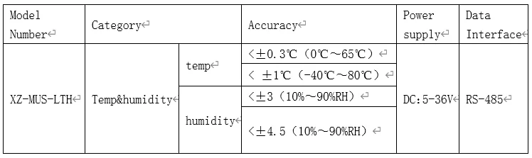 XZ-MUS-LTH adopts MODBUS protocol, CRC check standard MODBUS-CRC16, factory default baud rate 9600bps, 8N1 data format.