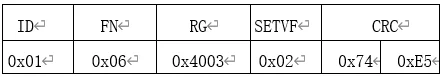01 06 40 03 02 74 E5ID: 0x01~0xFEFN: 0x06RG: 0x4003 Check bit register address 2 bytesSETVF:(0x01~0x03)set the check bit of XZ-MUS-LTH01: No parity 02: Even parity 03: Odd parityCRC: MODBUS-CRC16