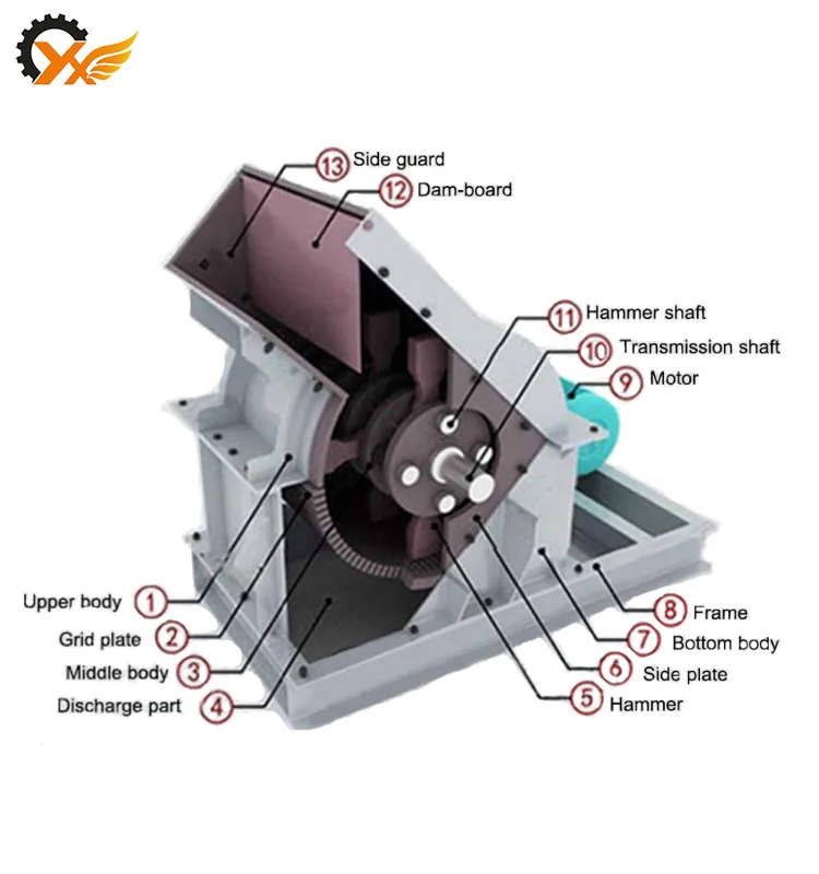 impacted by the hammer heads, finally the suitable size material will be discharged through the arc-shaped grate plate on the bottom of the hammer crusher.