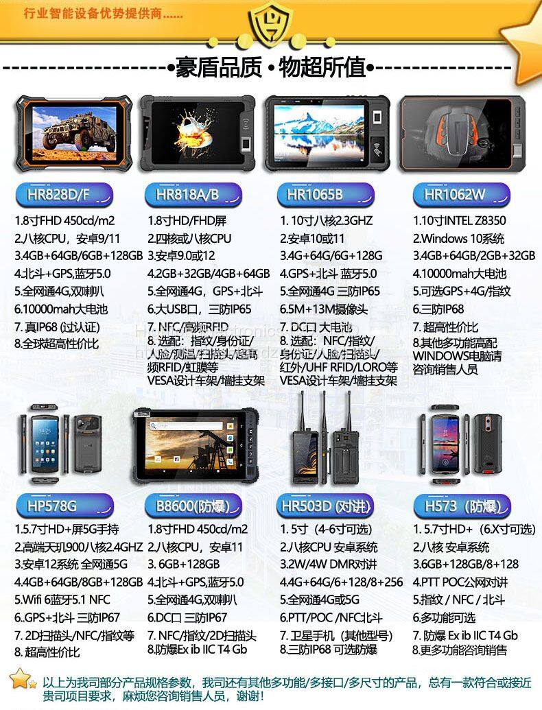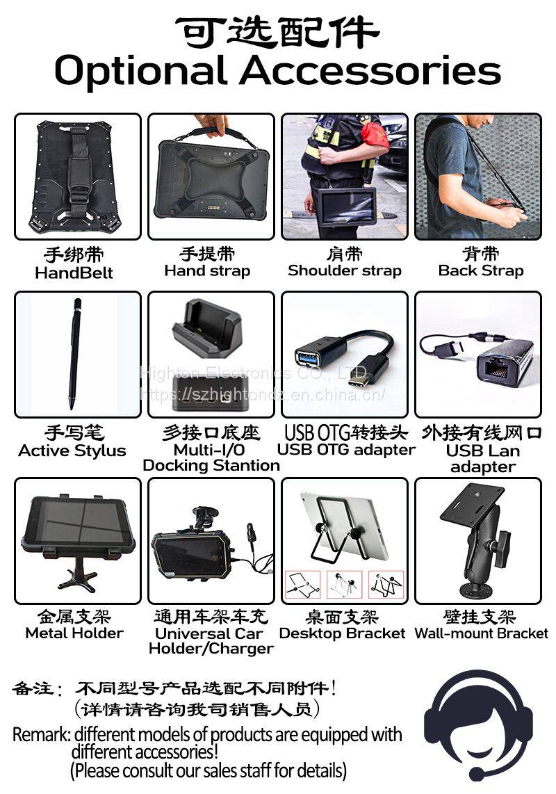 Highton Electronics CO., LTD manufactures all kinds of 4 to 12 inch Android or Windows rugged tablets or PDA Handhelds and other smart terminals, With many Optional functions: NFC, Fingerprint scanner, Barcode scanner, IC/ID card reader, LF/UHF RFID, walki-talkie/DMR, IRIS, Thermometer, satellite phone, ATEX/explosion-proof, your own module, and many other functions you want.