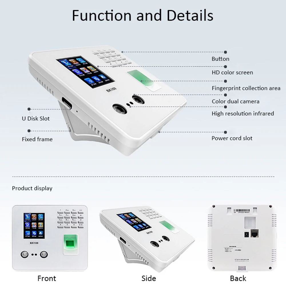 BK100 TCP/IP Biometric Fingerprint Face Facial Recognition Employee Time Attendance Machine With Keyboard Time Clock Recorder