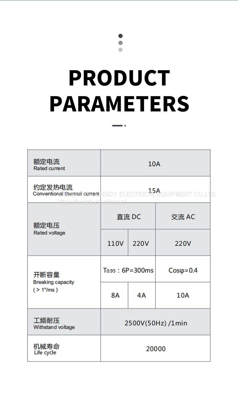 Breaking capacity: DC220V/4A,T0.95:6P=300ms;AC220V/10A,Cosφ=0.4
