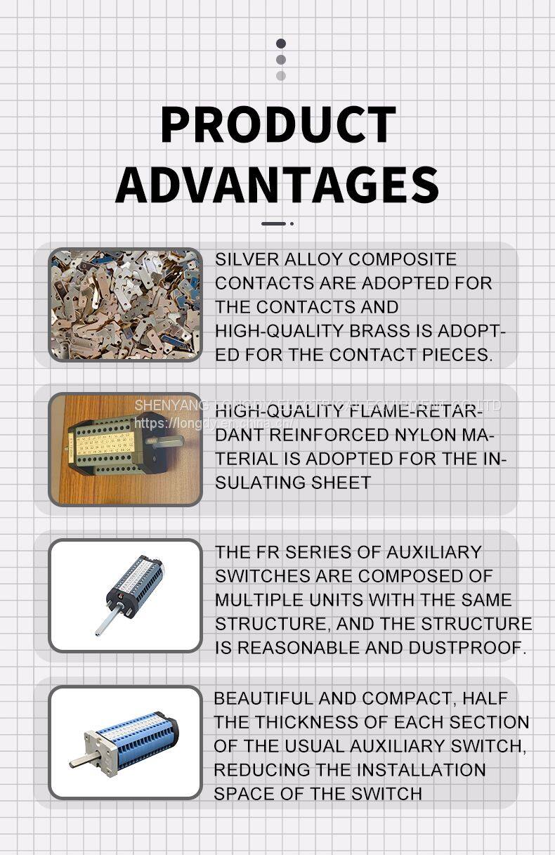FR series auxiliary switches are one of the supporting components for high-voltage complete sets of equipment. Their appearance is beautiful and compact, and the thickness of each section of the switch is only 6.5mm, which is about half of the thickness of each section of the usual auxiliary switches, reducing the installation space of the switch, and they are suitable for controlling various high-voltage switching operating mechanisms such as closing, breaking, interlocking, signaling circuits, and can also be used as change-over or combination switches, and they are also more suitable for use in the GIS combination electric apparatus. It is also suitable for use as a changeover or combination switch, and is more suitable for use in GIS combination electric apparatus and other actuators with a small internal space.