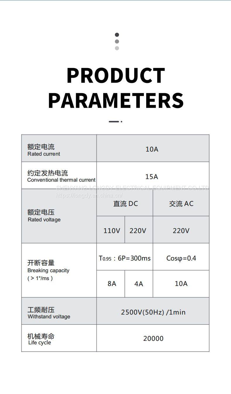 Breaking capacity:DC220V/4A,T0.95:6P=300ms,AC220V/10A,Cosφ=0.4