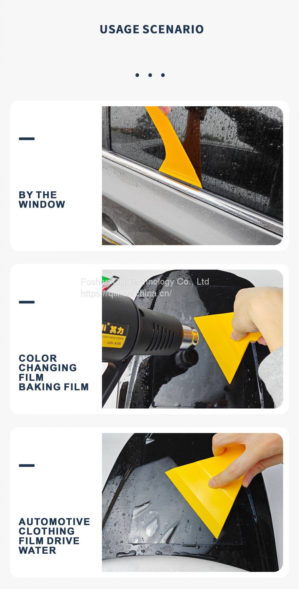 Company Profile: Foshan Qili Technology Co., Ltd was established on April 12,2018,Located in Jinshun Jinben Road,Foshan City,Guangdong Province. We have a factory of 11,000 square meters, with 8 production lines and over 200 employees.We focus on OEM & ODM service of heat gun,pvc welding gun,car wrapping tools,window tinting tools,plastic squeegees in different sizes, shapes and hardness, microfiber felts, water scrapers, PPF squeegees, Razor Scrapers & Blades, paperback cutters, Magnet Holder, tool bags and Testing Instrument.Our products are widely used in car wrapping, window tinting and cleaning, decals, films stickers vinyl application, and outdoor sign installation tools. Qili is a multi-directional development enterprise integrating design, development, processing and production. Our factory is equipped with injection molding machine, plastic laminating machine, laser engraving machine and bending machine.We have mold production workshop, injection molding workshop,hardware parts stamping workshop,circuit board production workshop, heating core production workshop, finished product assembly production workshop and product R & D and testing workshop. High quality, good price, fast delivery and quality service are our philosophy. The company has more than 20 engineers in design and development, engineering technology, and quality control.They will provide you with products and services with a very professional and dedicated spirit. Since the launch of its first tool product, Our hot air gun and film tool related products have been exported to 97 countries and regions such as North America, South America, Europe, Oceania, Asia, the Middle East and Australia. If you need the best one-stop OEM/ODM service, please choose us! Sincerely look forward to your visit and sincere cooperation with our company! |