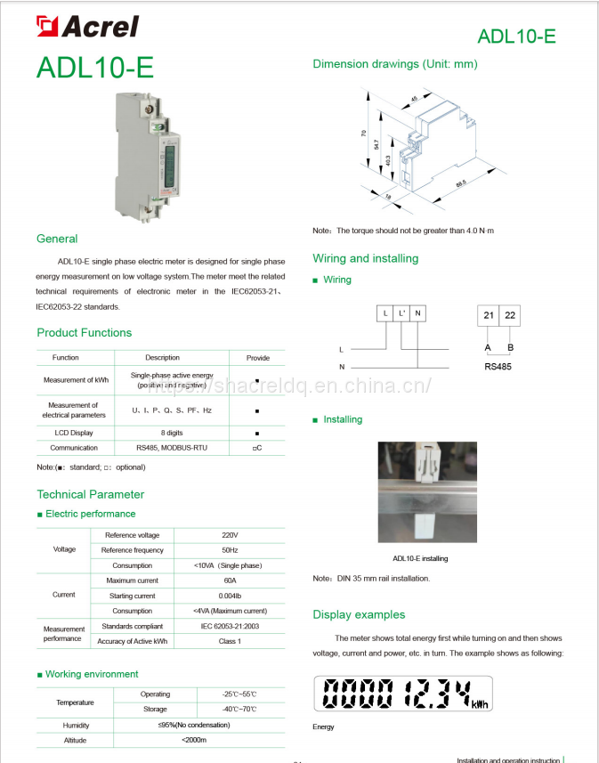 Acrel ADL10-E 1P Single Electric Energy Meter Single Total Active Energy Measure