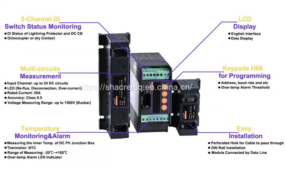 AGF-T Perforation type PV confluence acquisition device is specially designed for smart PV combiner box. It is used for monitoring the running state of solar panels in solar cell arrays, measuring the currents of solar cell, detecting the state of surge protection devices and DC breaker. The device is equipped with RS485(Modbus)