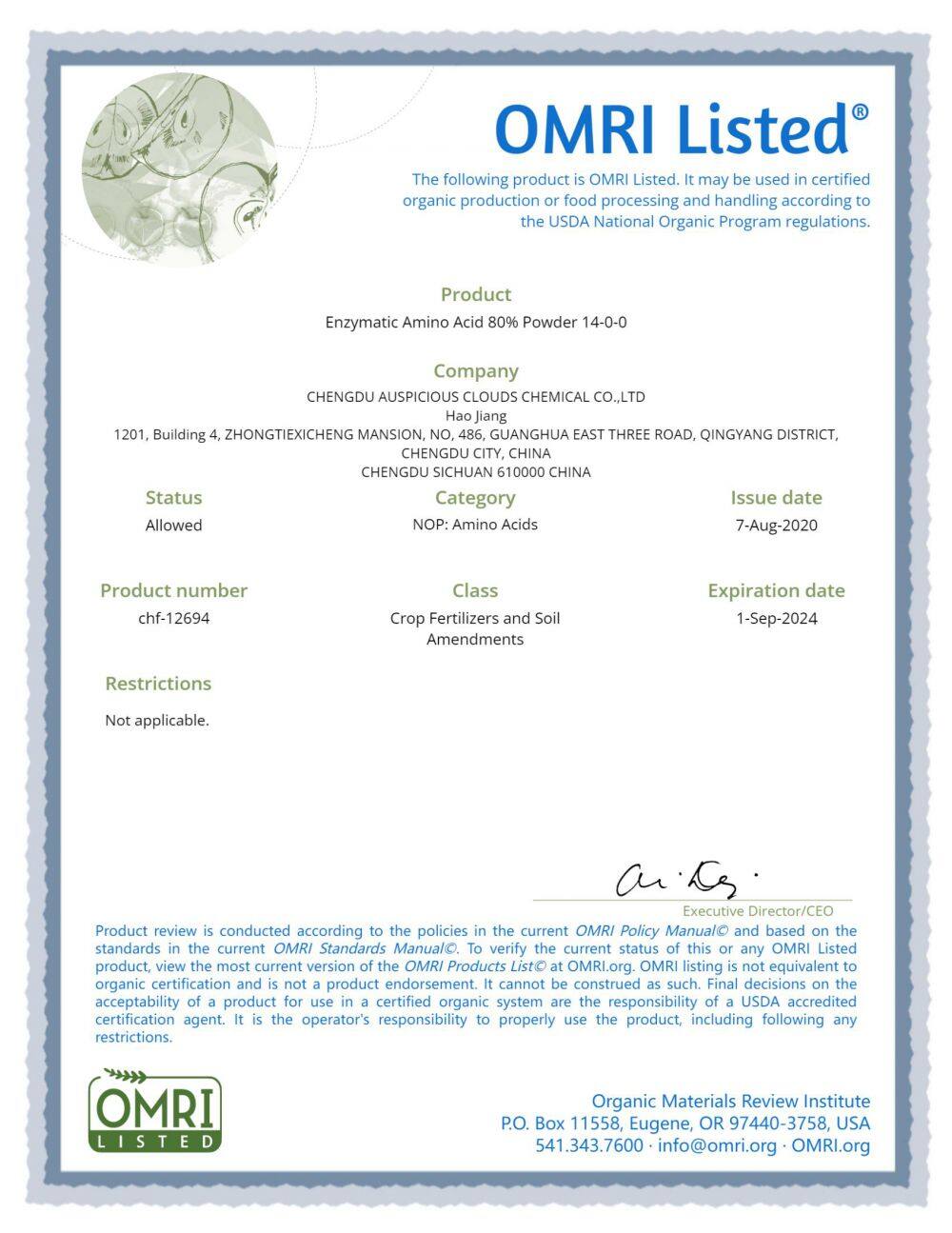 Amino Acid powder 80% 14-0-0 consists of 80% water soluble amino acids (AA) derived from enzyme digestion of Non-GM soybean protein. AA is essential building blocks of life, and it is synthesized from acquired nutrients, with the expend of energy and time. Therefore, to feed AA to plant is to bypass the synthetic process and is an attempt to gain efficiency in growth.