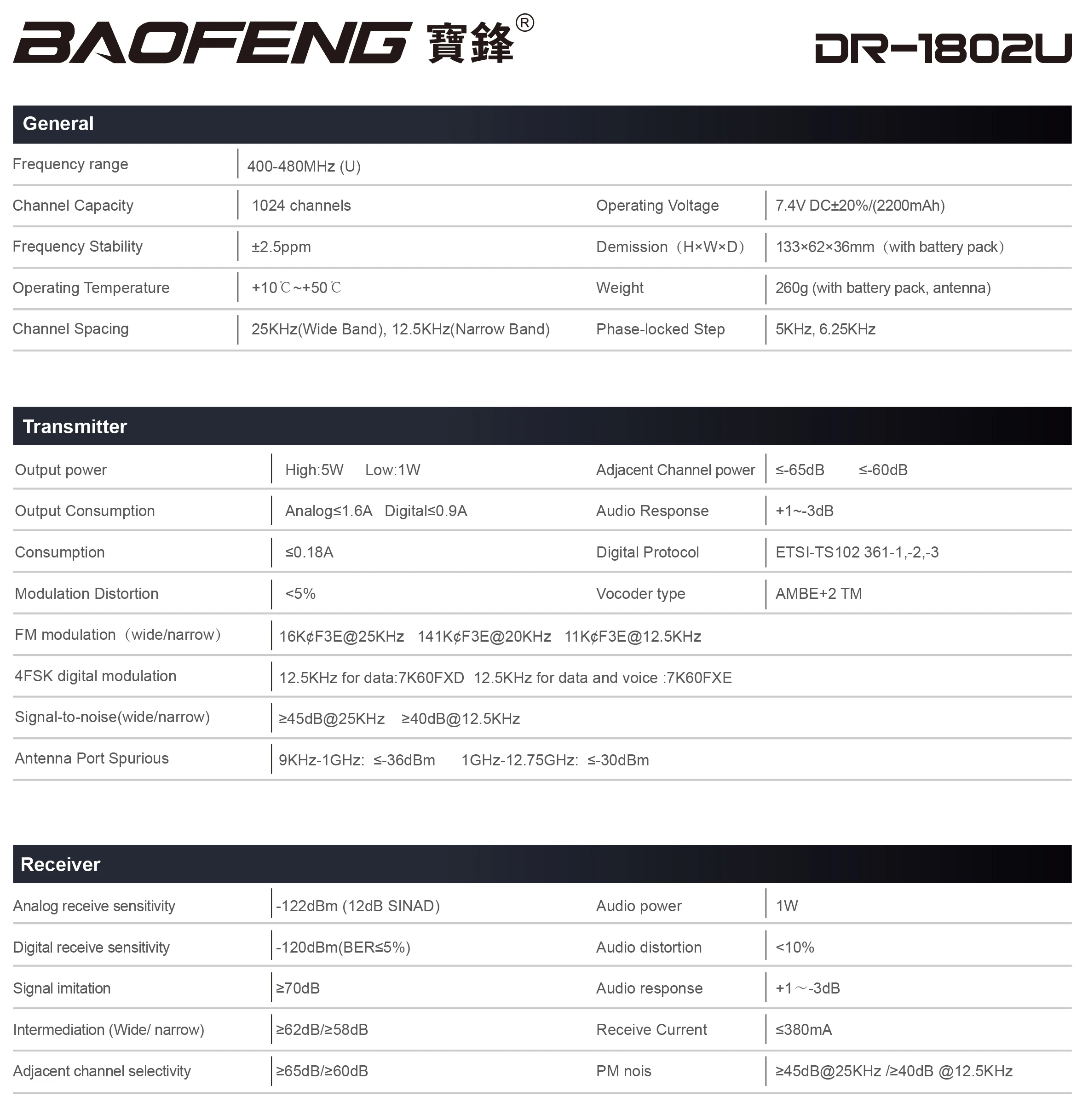 Supports UV dual-band, frequency range UHF400.000- 480.000MHz