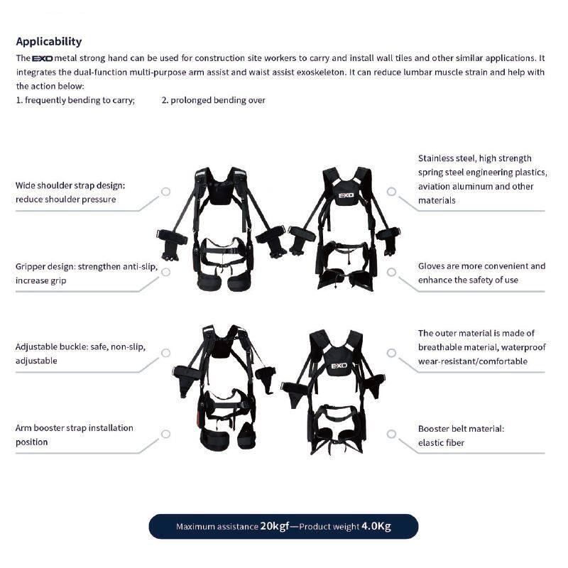 STRONG HANDS is a new type of constructional exoskeleton that greatly enhances the wearer's productivity and reduces the pressure and torsion of the L5/S1 disc area when the wearer's back is bent and torsion of the L5/S1 disc area when the wearer's back is bent down. Through reasonable ergonomics and structural design, the user's strength and freedom of action are greatly enhanced.