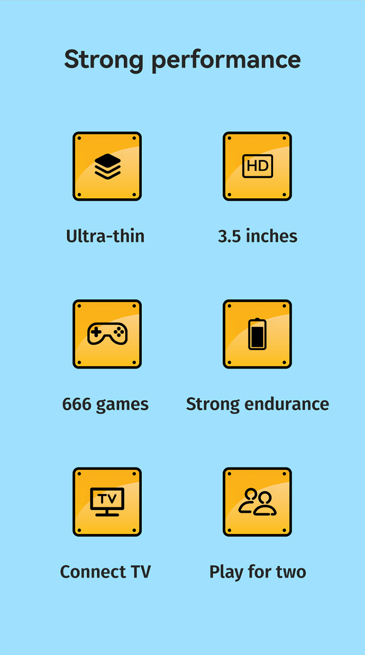 2. With 3.5 inch large screen, more than 666 games, ultra-thin body, 3 hours of smooth gameplay.3. No need for converters, directly connected to modern TV sets, better color expression, restore the game screen, and enjoy the immersive game console experience.