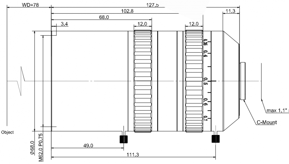 TelecentricVariable Vari-magnification Lenses Image Size 1.1" φ18.2mm 0.35X~0.7X Magnification Working Distance 78mm TV Distortion<0.1% Telecentricity 1.35~0.17° DOF ( Depth of Field ) 3.3~1.1mm Camera Lens Positioning Measurement Defect Inspection