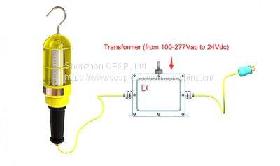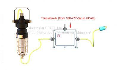 This Drop Light is 360 beam angle, comes complete with 10 meters (according to your requirement can be more longer) of explosion proof cord and an inline transformer that steps down 220V AC to 24V AC or DC for powering the lamp. The hand lamp is designed to provide an effective low voltage lighting solution for operators requiring a versatile source of illumination.