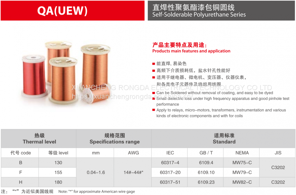 INSULATION ENAMELLED COPPER WIRE QA(HS:854411)is one kind of magnet wire which is consisted of bare round copper which accord with EN 13601Cu-ETP standard as the conductor and multi-layer insulation layers. The multi-layer insulation layers can be polyester, modified polyester or polyester-imide and so on.