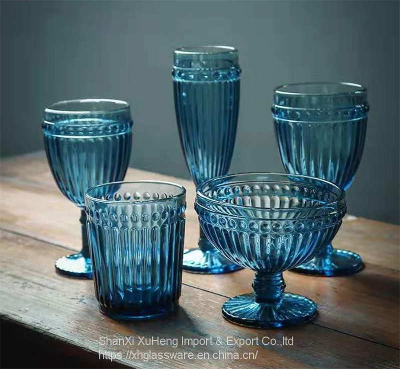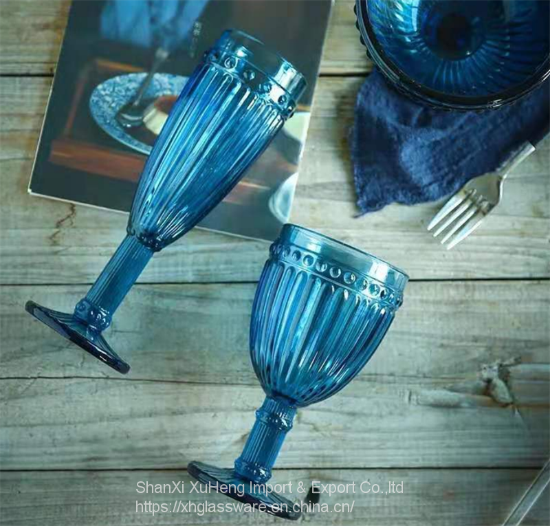 Navy Blue Colored Vintage Embossed Flute Wine Goblet Water Glassware And Ice Cream Glass Cup