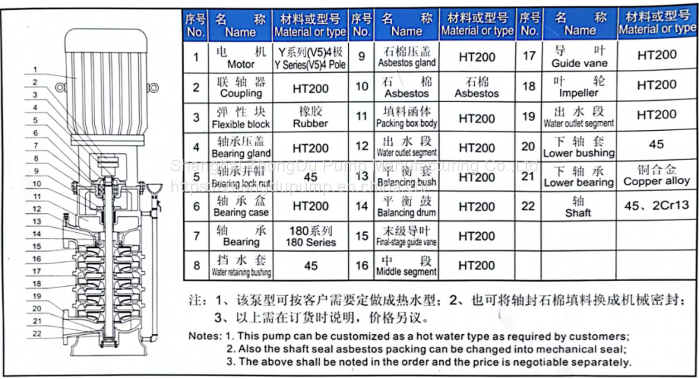 DL and DLR series vertical multi-stage centrifugal pumps (low revolution speed n=1,450r/min) are new-type products developed by our company in accordance with the actual market demand for water supply to high-rise buildings and the standard of Fire Department of China: GB6245-1998 Performance Requirements and Test Methods for Fire Pumps. They are used to transport media which are free of hard grains and whose physical and chemical properties are similar as those of water. Its flow range is within 5~36m3/h, lift head range within 20~300m,related power range within 1.5~280kW and diameter range within DN40~DN200mm. One pump can be provided with 1 to 5 outlets.