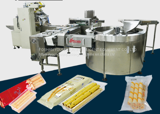 Egg roll without tray feeding & packing line is made of feeding tape, rotating plate stacking machine, automatic linear feeding unit, tailstock ( bracket ) of machine and packing machine, using the centrifugal force of the rotating plate stacking machine to settle the irregular material and feed into the automatic linear feeding machine unit in series, packing in positioning process.