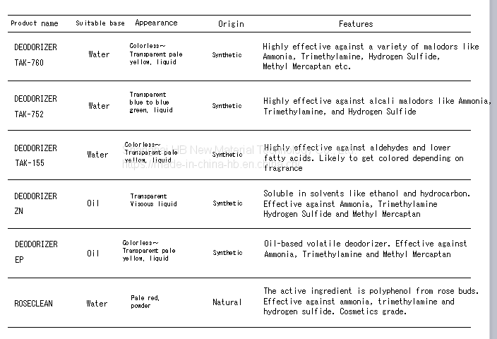 There are a variety of sources of bad odors in our living environment, and each source causes different malodorous substances. In addition, the causative substance is often a mixture of chemicals. Therefore, deodorizer products are required to have a composition that can deodorize a wide range of maladors in many cases. Moreover, there is a wide variety of formulations in which deodorants can be used, including water-soluble, oil-soluble, liquid, gel, and other types. For this reason, we have developed this lineup to provide the most suitable product for each different demand, as a specialist in the