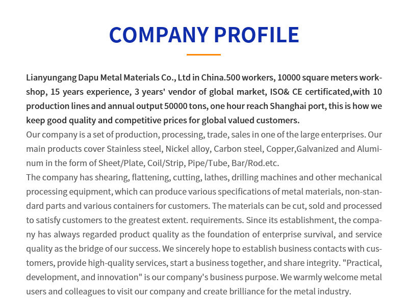 Lianyungang Dapu Metal Materials Co., Ltd in China.500 workers, 10000 square meters workshop, 15 years experience, 3 years\' vendor of global market, ISO& CE certificated,with 10 production lines and annual output 50000 tons, one hour reach Shanghai port, this is how we keep good quality and competitive prices for global valued customers.Our company is a set of production, processing, trade, sales in one of the large enterprises. Our main products cover Stainless steel, Nickel alloy, Carbon steel, Copper,Galvanized and Aluminum in the form of Sheet/Plate, Coil/Strip, Pipe/Tube, Bar/Rod.etcThe company has shearing, flattening, cutting, lathes, drilling machines and other mechanical processing equipment, which can produce various specifications of metal materials, non-standard parts and various containers for customers. The materials can be cut, sold and processed to satisfy customers to the greatest extent. requirements. Since its establishment, the company has always regarded product quality as the foundation of enterprise survival, and service quality as the bridge of our success. We sincerely hope to establish business contacts with customers, provide high-quality services, start a business together, and share integrity. \"Practical, development, and innovation\" is our company\'s business purpose. We warmly welcome metal users and colleagues to visit our company and create brilliance for the metal industry.Our tenet: honesty is the foundation of a person, and also the operating principle of an enterprise. We have always followed the \"integrity-based\" business philosophy to provide first-class stainless steel products for our friends at home and abroad. In the future entrepreneurship, the company will continue to increase the development of new products, continue to open up new fields, and continue to adhere to the principle of \"pursuing excellence and being sincere forever\" with a new attitude to serve our customers wholeheartedly.The company\'s business philosophy: \"The same product is better than quality, the same quality is better than price, the same price is better than service, the same service is better than reputation\".If any product meet your demand, please share with me material grade, size, quantity or other requirement.Our formal quotation will sent to you asap.We\'re sure your any inquiry or requirement will get prompt attention.