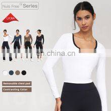 Contrast Color Yoga Crop Tops For Women Breathable Long Sleeve V Neck Custom Gym Fitness Tight T Shirts
