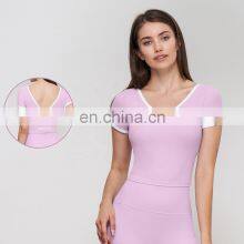 Contrast Color Slim Casual Yoga Short Sleeve Tops Wholesales Sports Deep V Neck Plain T Shirts