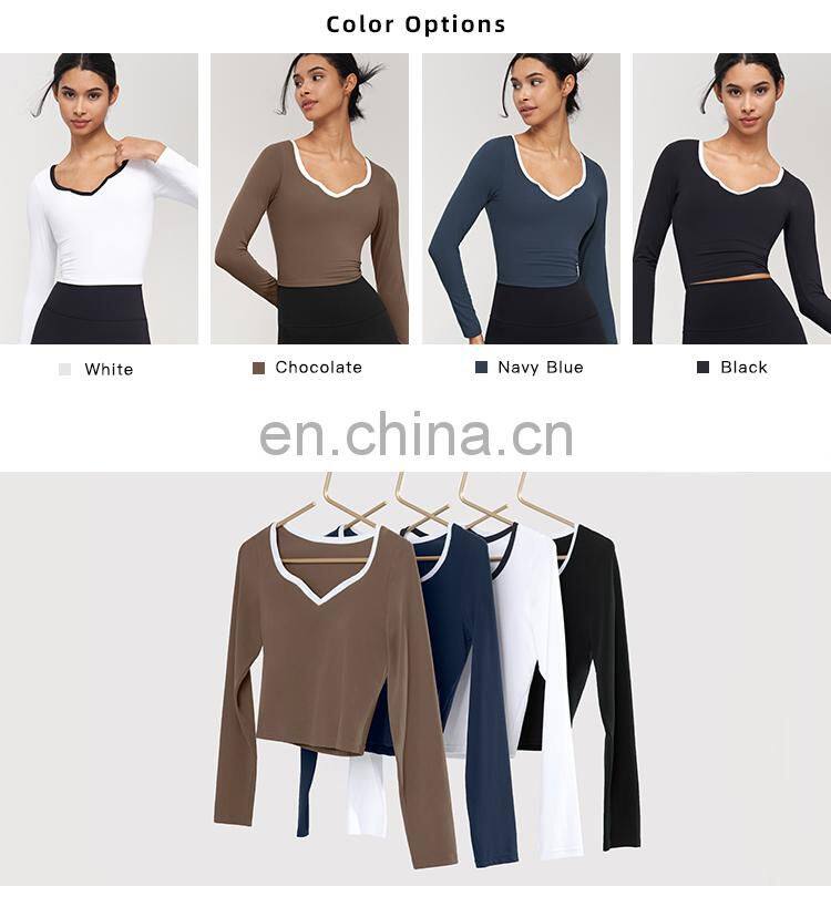 Contrast Color Yoga Crop Tops For Women Breathable Long Sleeve V Neck Custom Gym Fitness Tight T Shirts