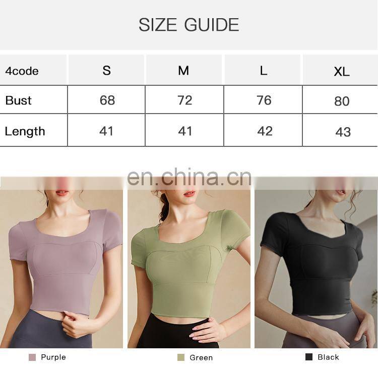 Hollow Shoulder Short Sleeve Sports Shirts With Fixed Cups Custom U Hem Fitness Yoga Wear Tops