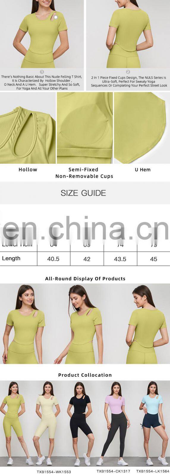 Product Name | Hollow Shoulder Short Sleeve Sports Shirts With Fixed Cups Custom U Hem Fitness Yoga Wear Tops | ||||||