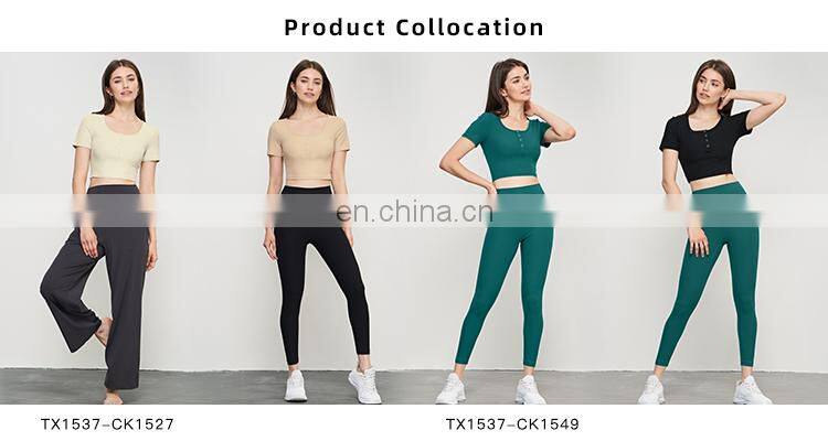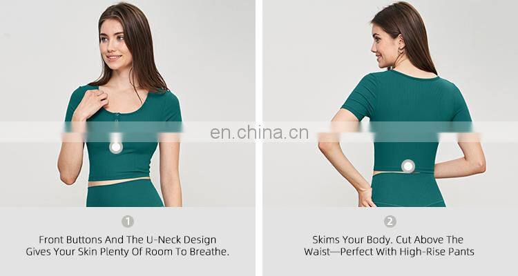Home > Products > Sports T-shirt > Soft Ribbed Front Botton Short Sleeved T-Shirts Wholesale Women Tight Yoga Crop Tops