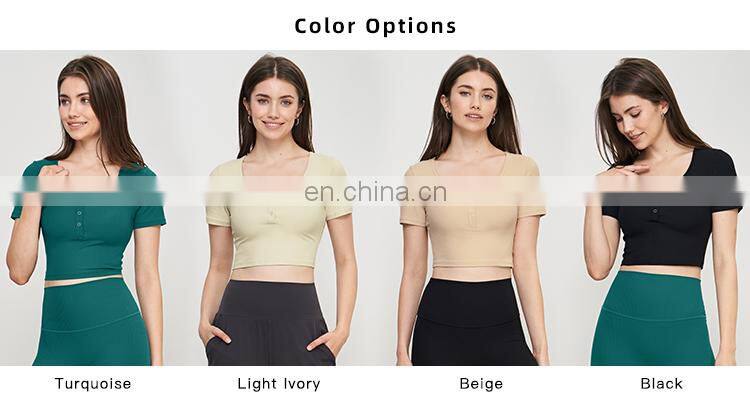 Product Name | Soft Ribbed Front Botton Short Sleeved T-Shirts Wholesale Women Tight Yoga Crop Tops | ||||||