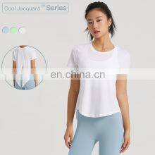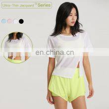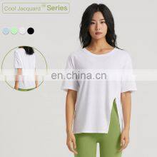 Cool Jacquard Short Sleeved T-Shirts Custom Logo Women Back Slit Yoga Summer Tank Tops