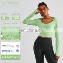 Ribbed 2 In 1 Piece Long Sleeve Yoga Crop Tops Wholesale Womens Square Neck Sports Bras