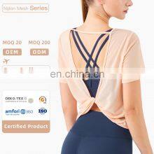 Side Spilt Sports Mesh Short Sleeve Tshirts Womens Custom Polyester Backwards Yoga Tops