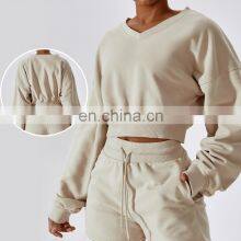 V Neck Fleece Oversized Tops Women Pullover Wholesale Cropped Hoodies Sweatshirts 50cotton 22polyester